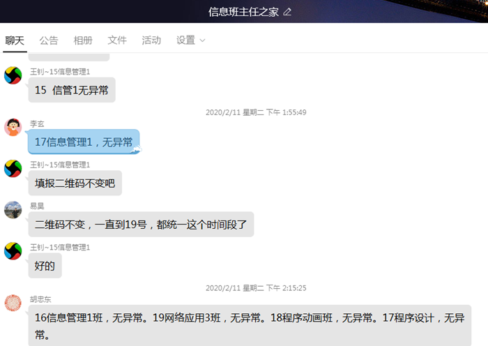 首先,提高政治站位、强化学习。该院积极学习学校党委关于新型冠状病毒感染的肺炎疫情防控工作文件,提高政治站位、迅速落实各班学生假期健康情况,积极汇报,追踪管理,保证各项数据的准确性。其次,分层逐级管理、对账销号。为提高学生健康系统申报数据的准确性,易昊副院长第一时间建立“战疫”班主任工作群、班长群,发布工作计划,刘文元老师提供计算机技术支持,采取多个表格比对名单,分时分层通报各班级完成率和学生名单,及时高效,使填报人员覆盖率达到100%,并做到学生数据无遗漏、无多报、无错报。再次,发挥专业优势,营造宣传氛围。该院组织广大学生积极发挥专业优势,运用多媒体技术和影视制作技术,创造一些内容精良、寓意深刻、色彩绚丽的宣传海报和视频,在学生微信群和QQ群转发,营造了“战疫”的浓厚氛围,强化了学生的安全教育。最后,齐心协力攻关、彰显奉献担当。该院广大班主任老师放弃休息日,不分昼夜在家中工作。胡忠东老师经常为了个别不按时打卡的学生,工作到凌晨一两点钟;甚至为了确保填报信息的准确性,专门从家开车到学校校对数据;刘玉叶老师刚生完孩子不久,还在产假休养中,为了数据填报的准确及时,主动放弃休息,在班级群里指挥工作,常常至深夜。该院教师肩负着网课的学习与制作,工作量十分巨大,但是自觉舍弃个人休息,将个人的小我融入到学校的大我之中,在这场没有硝烟的战争中,争做最美“逆行者”,为保护学生的安全,筑起了钢铁长城。