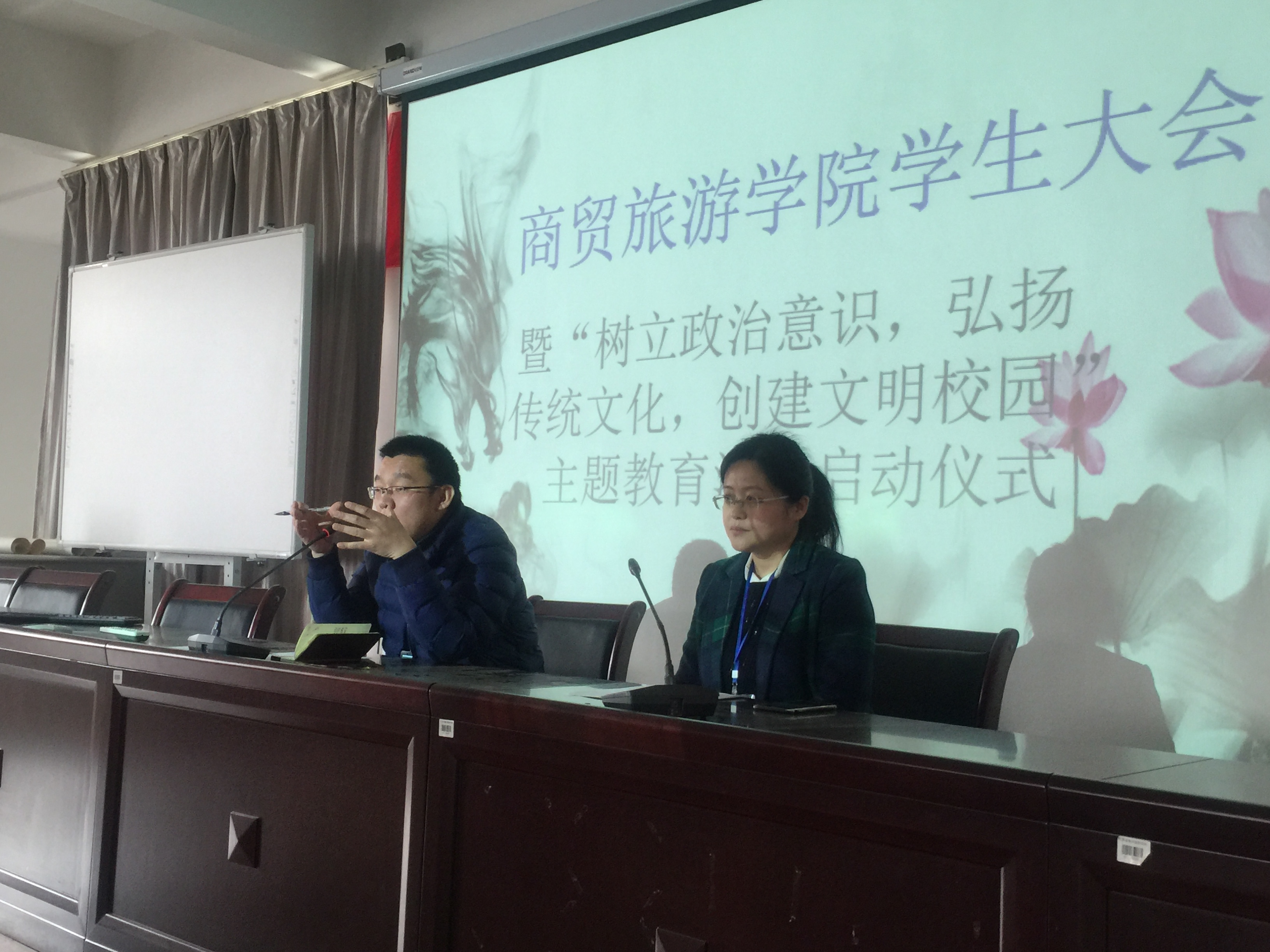 3月1日中午,商贸旅游学院在五楼报告厅召开学生大会暨“树立政治意识,弘扬传统文化,创建文明校园”主题教育活动启动仪式。副院长张媛到会做动员报告,学生科科长兼团总支书记何蒙主持会议。