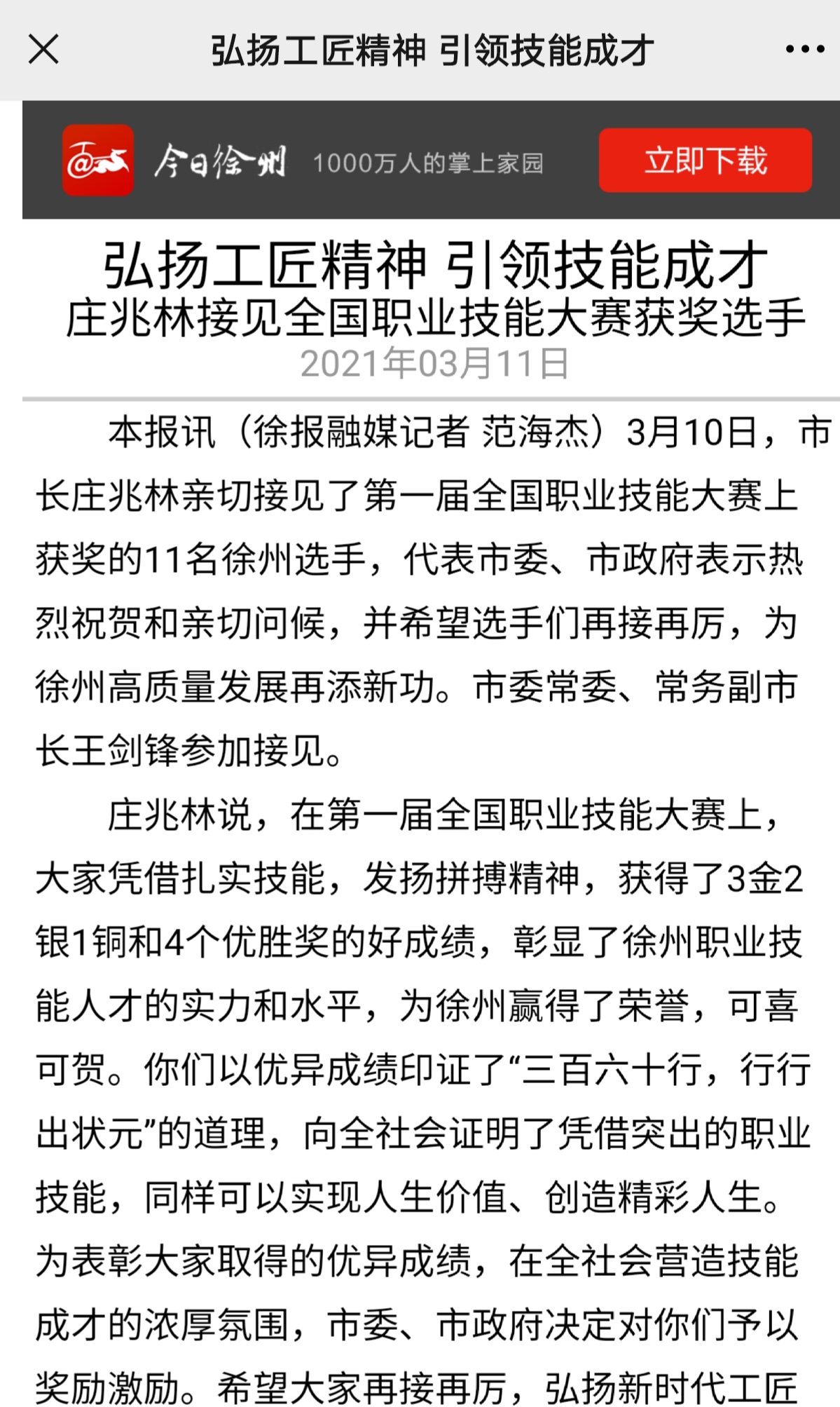 《今日徐州》弘扬工匠精神 引领技能人才--庄兆林接见全国职业技能大赛获奖选手