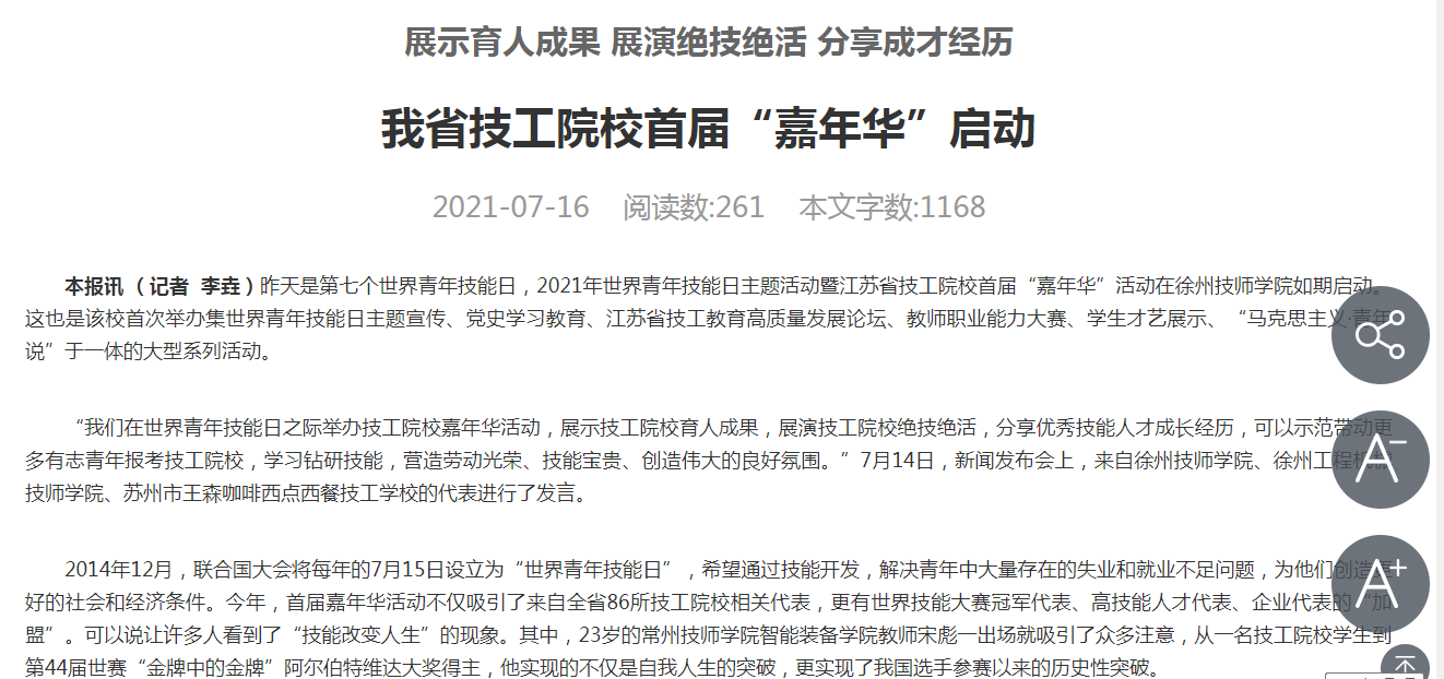 《江苏工人报》展示育人成果 展演绝技绝活 分享成才经历 我省技工院校首届“嘉年华”启动