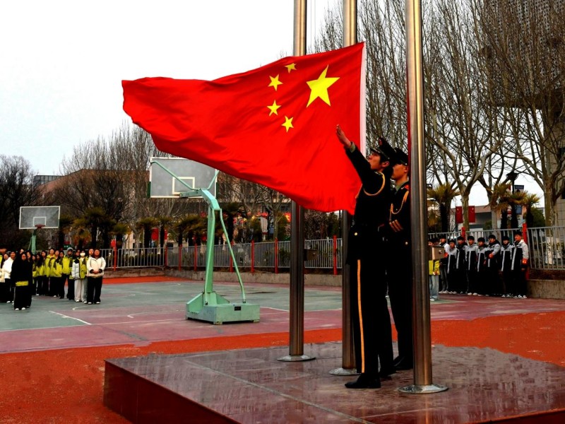 伴随着《义勇军进行曲》,五星红旗冉冉升起,全体人员肃立注目、高唱国歌,展现出新时代师生昂扬向上的精神风貌。