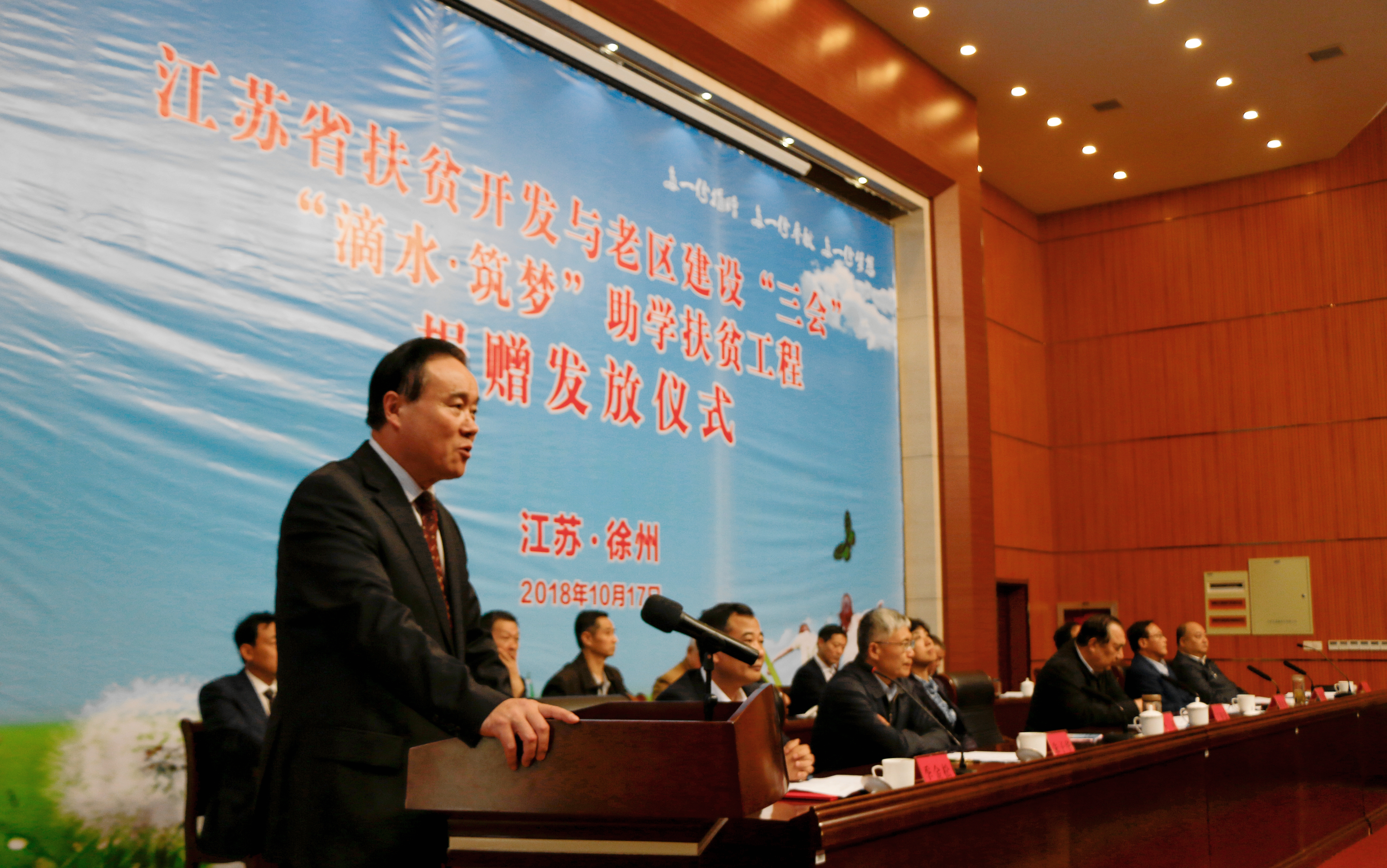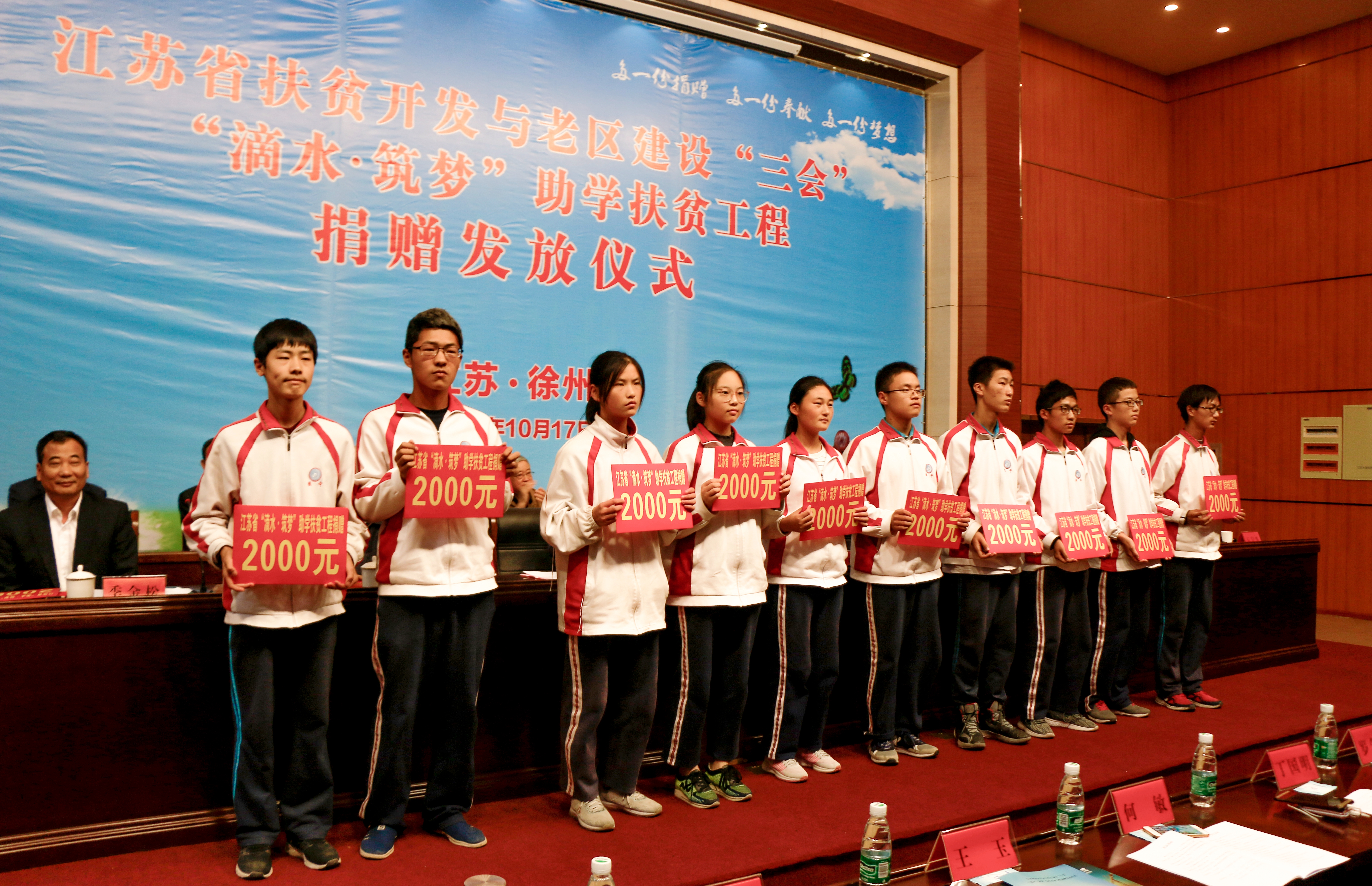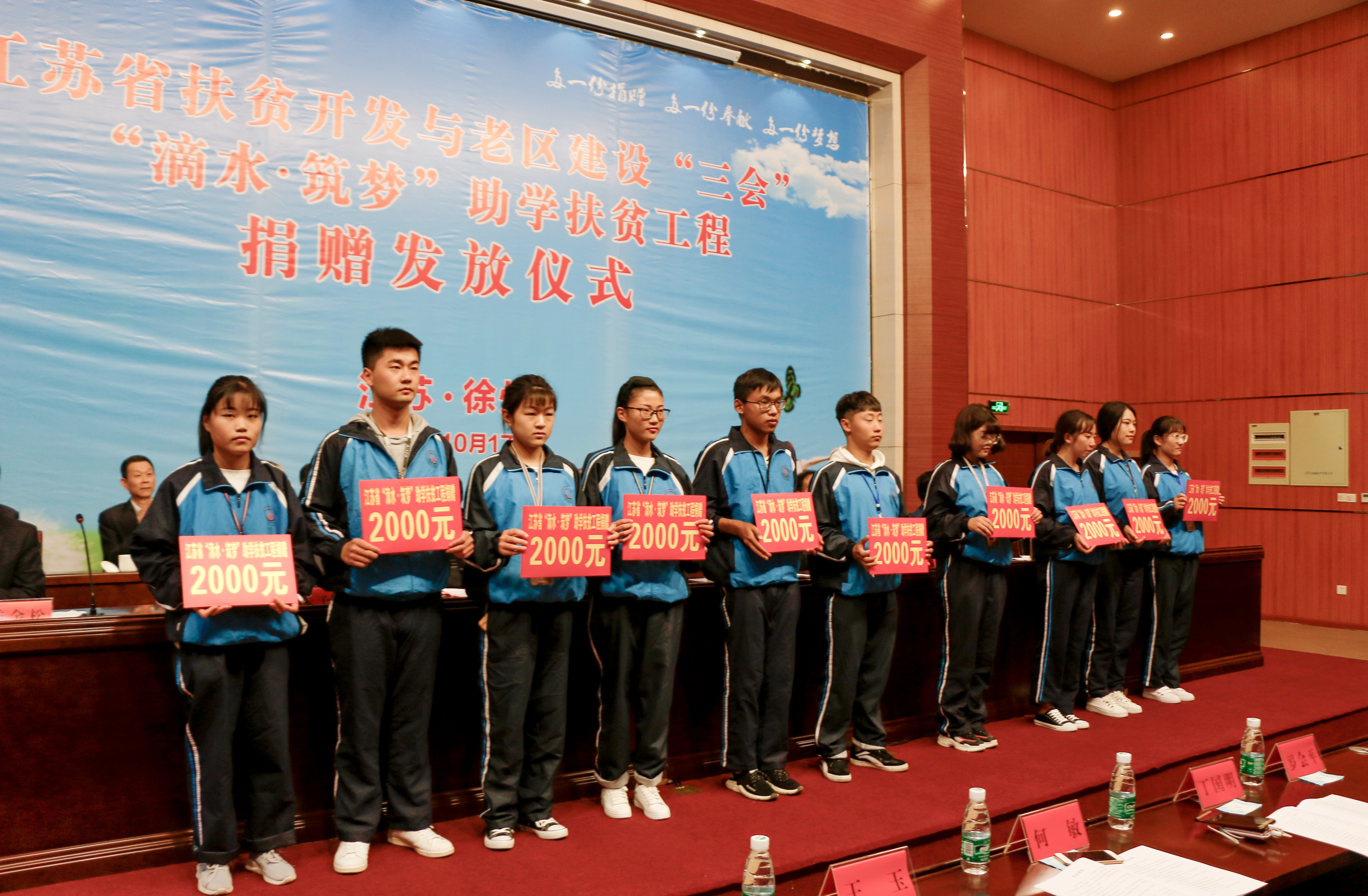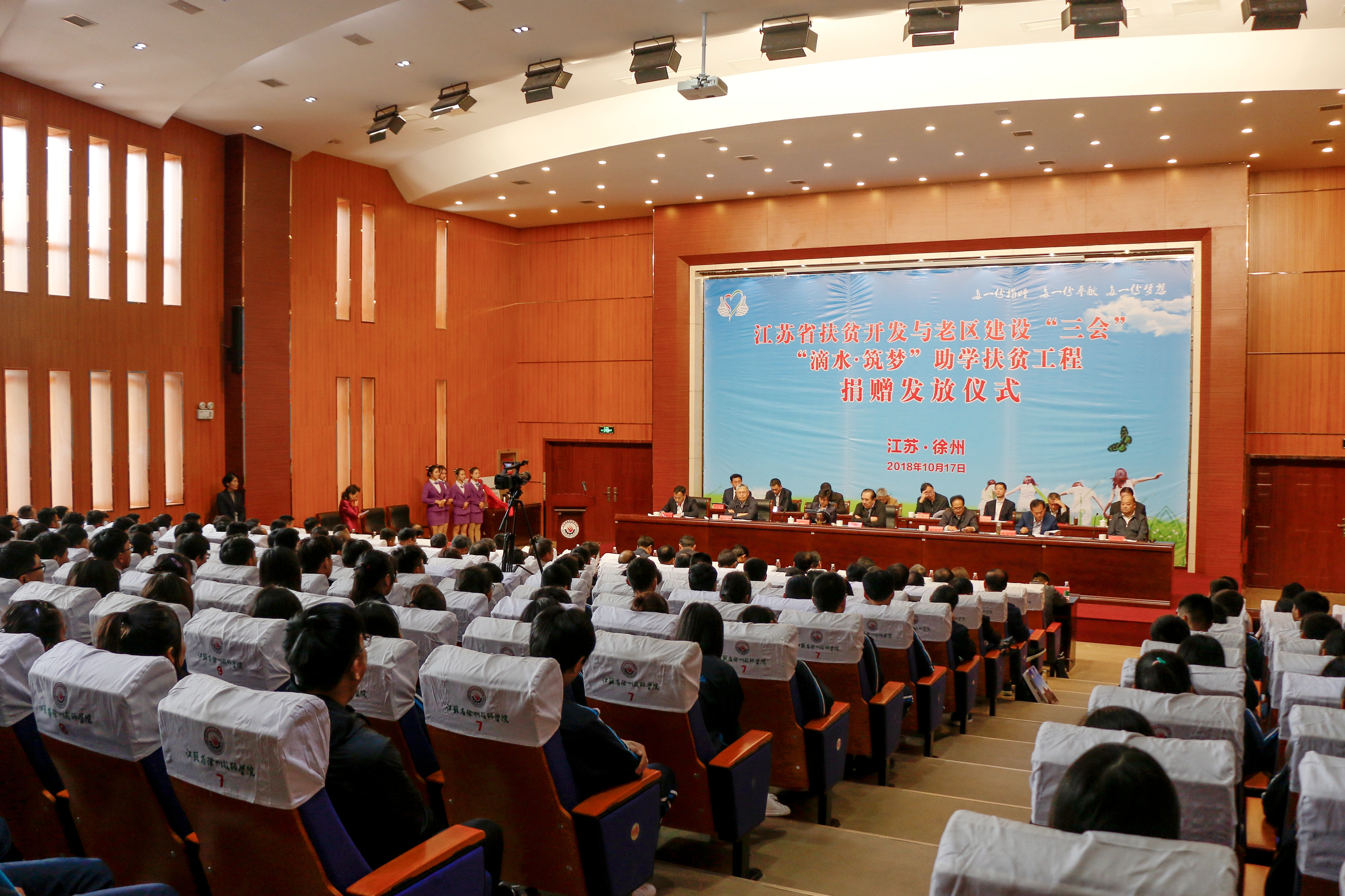 在全国第五个“扶贫日”到来之际,江苏省老区开发促进会、江苏省扶贫基金会、江苏省扶贫开发协会(以下简称省扶贫“三会”)主办的“滴水•筑梦”助学扶贫工程捐赠发放仪式,于10月17日下午在我校报告厅隆重举行。