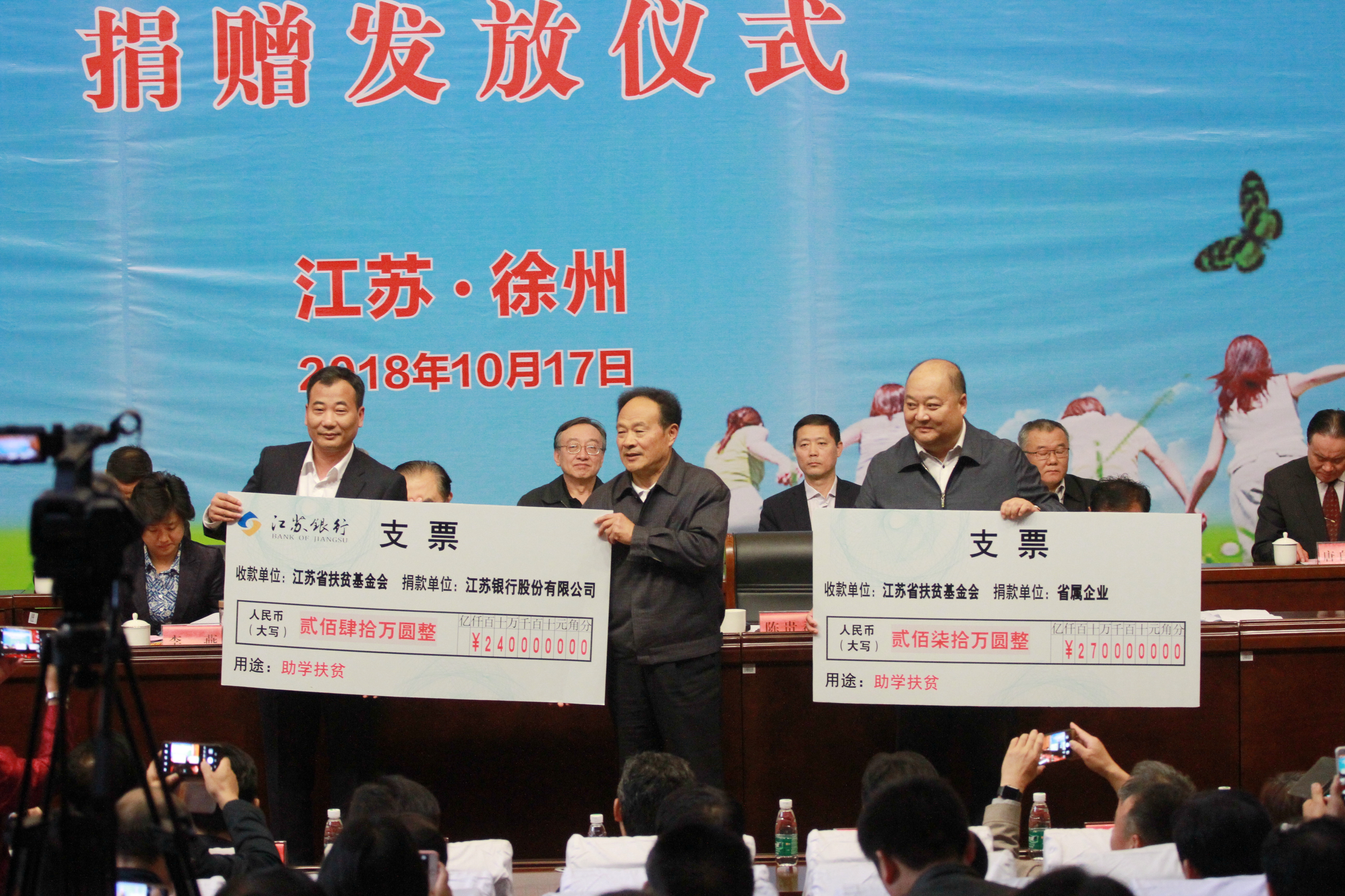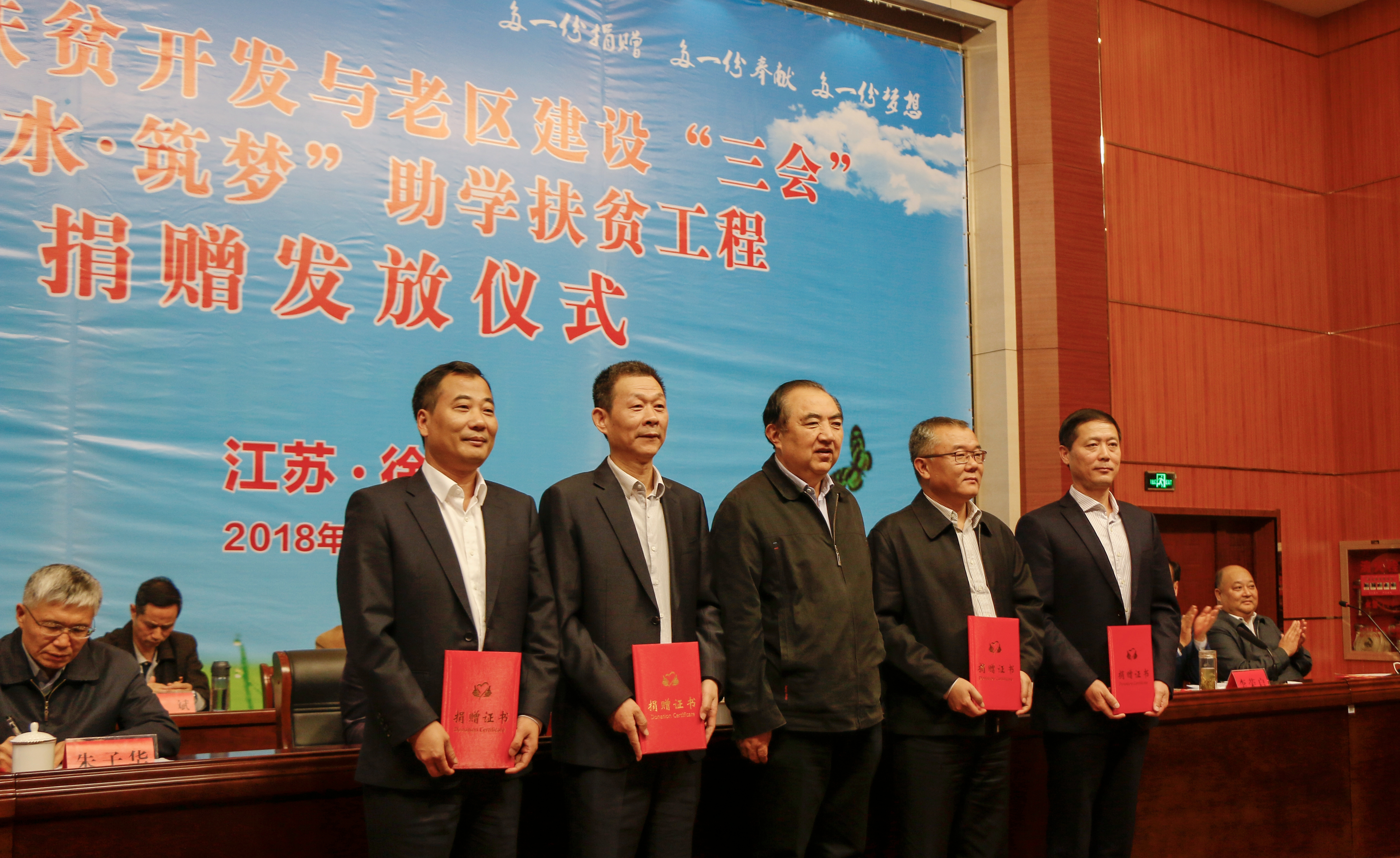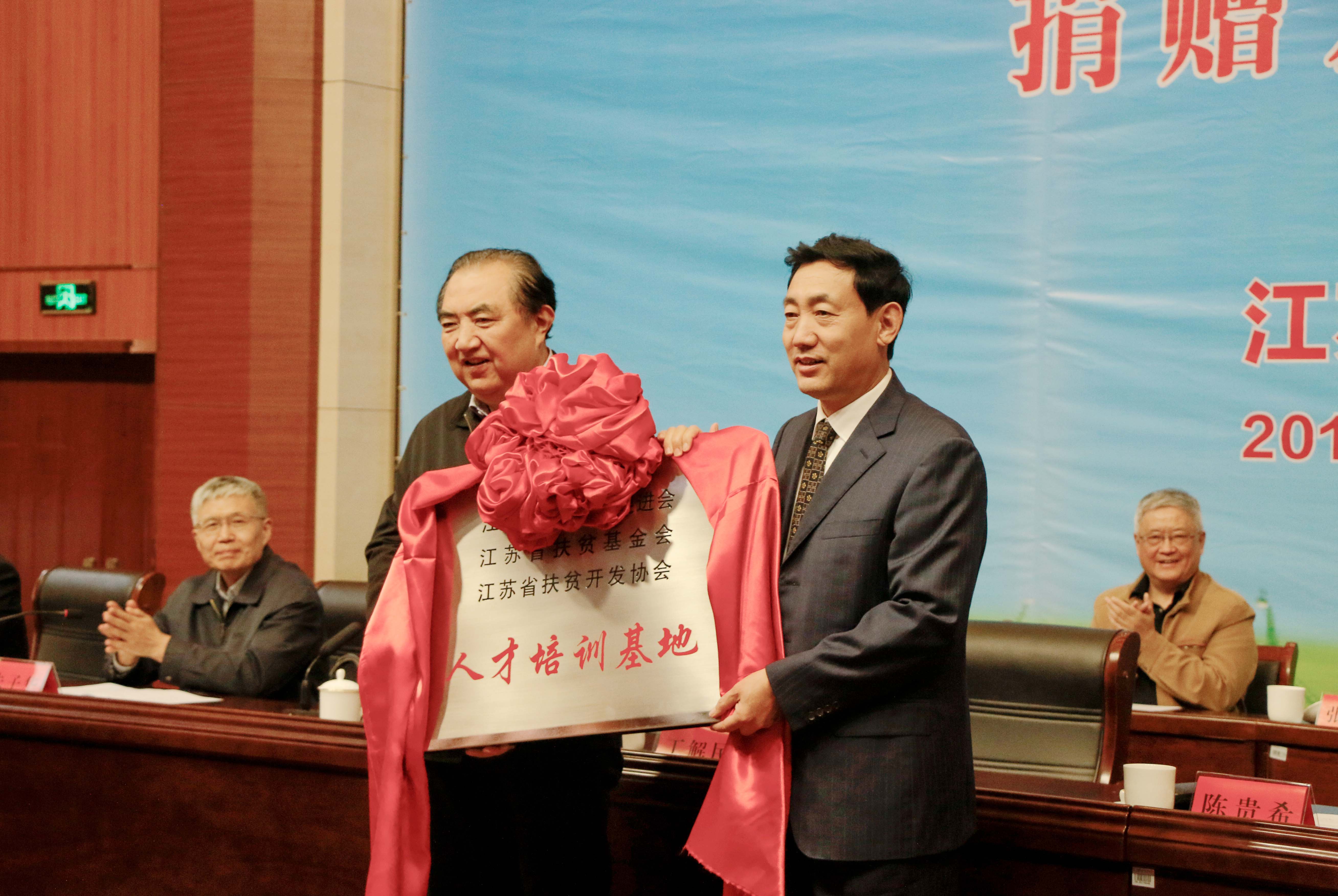 省扶贫“三会”理事长丁解民,副理事长陈贵希、张益新、张晓未、袁斌;省扶贫办副主任朱子华;省国资委副主任、省扶贫“三会”副理事长王宁生;省国信资产管理集团有限公司副书记朱志勇,江苏银行股份有限公司纪委书记季金松;徐州市副市长李燕,我校党委书记朱志杰、院长唐自强出席仪式。来自徐州、淮安、连云港、盐城、宿迁5市12个重点县的帮扶“三会”负责同志、13所省扶贫“三会”人才培养基地院校负责同志,以及受捐赠的学生代表参加活动。徐州市“两会”理事长李荣启主持仪式。