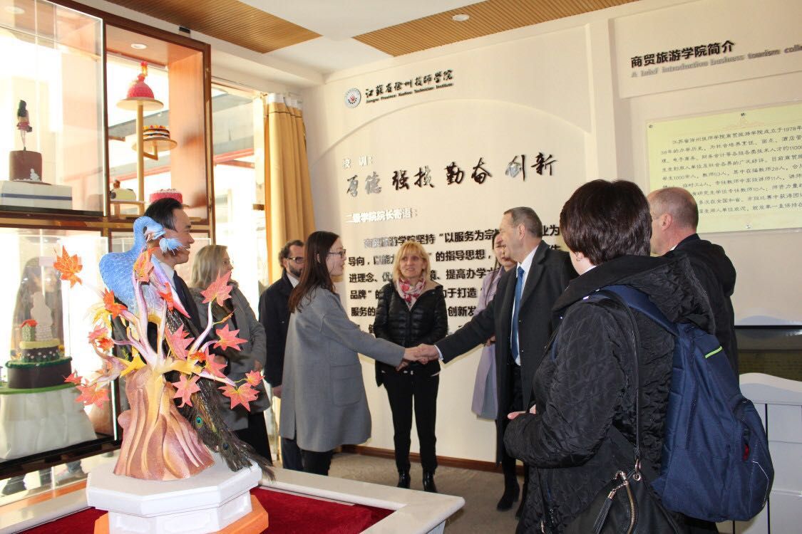 Galik主席一行参观了商贸旅游学院实习实训中心,并在彭祖养生宴校外实训基地举行座谈。座谈会上,唐自强介绍了烹饪专业的优势及特点,克拉科夫通讯技术学校副校长Golab女士、克拉科夫第一美食学校副校长Matsik女士分别介绍了两校的基本情况。随后,双方就互派学生参加夏令营、互派交换生及双方教师进修等细节问题进行交流,并签订了交流合作协议。双方将在烹饪、电气两个专业加强交流与合作,进一步探索多种合作渠道。