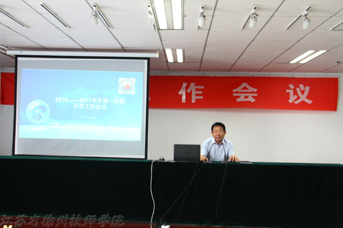会上,沈士德院长代表校党委、行政做了学期工作报告,简要总结了暑期工作,全面部署了新学期二十三项重点工作。他指出,新学期我们要继续深入推进“两学一做”学习教育,持续加强师资队伍建设和专业课程建设,积极推进实践教学平台建设,做好职业技能鉴定、培训和技能大赛相关工作,不断提升教学管理水平,拓展深化校企校地合作,全力做好招生就业工作,加强对学生的教育管理,开展丰富多彩的校园文化生活,逐步提高信息化服务水平,不断增强学校内部治理能力,持续优化管理运行机制,加强财务审计资产管理工作,不断提升后勤管理服务,加快校内各项工程建设,扎实开展绩效考核,加强干部队伍、和谐校园建设及宣传思想教育工作,深入开展党风廉政建设,切实加强基层党建工作。