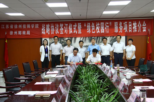 7月8日下午,江苏省徐州技师学院、徐州邮政局战略合作协议签订仪式暨“绿色校园行”服务项目推介会在我校举行。徐州邮政局党委书记、局长周怀成,副局长李磊,我校院长沈士德、副院长唐自强等出席签约仪式。教务处长徐雪礼主持活动。
