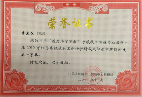 在扬州举行的江苏省机械加工制造教研成果评比中,我院参评论文7篇,教案2份,其中李志江老师的论文《用“教师为了不教”导航技工院校专业教学》荣获一等奖,李培丰老师的论文《校企结合“零距离”培养CAD制图员人才》荣获三等奖,吴建丽老师的教案《铁碳合金相图的绘制与识记》荣获三等奖。