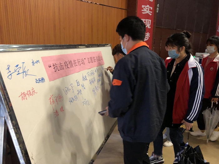组织宣传处处长蒋余强宣读了徐州市云龙区民祥园社区对王秋惠同学的表扬信。随后,16运管4班王秋惠同学进行抗疫事迹报告。轨道交通学院田爱军院长宣读对王秋惠同学的表彰决定。在党委副书记胡恒庆的带领下,全体师生进行了“抗击疫情在行动”志愿签名活动。