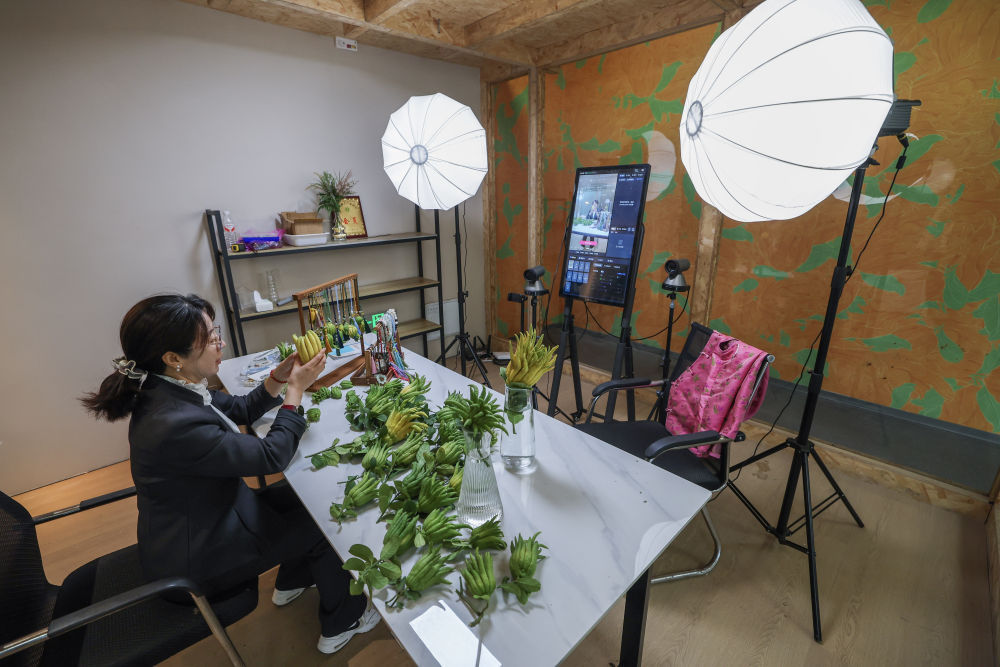 在浙江金华市金东区赤松镇北山口村的金华佛手农林服务中心内的直播间,工作人员进行佛手鲜果及衍生产品的直播销售(2025年10月22日摄)。新华社记者 徐昱 摄