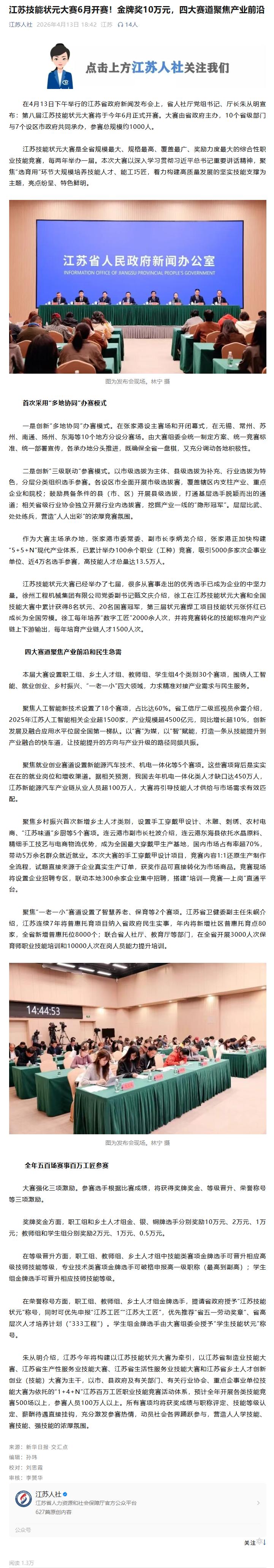 江苏技能状元大赛6月开赛!金牌奖10万元,四大赛道聚焦产业前沿